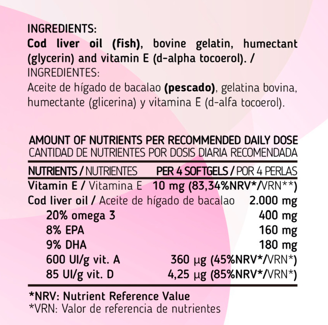 Es una fuente de vitaminas A y D y una grasa llamada omega-3. El aceite de hígado de bacalao contiene ciertos "ácidos grasos" que evitan que la sangre se coagule fácilmente. Estos ácidos grasos también reducen el dolor y la hinchazón.
