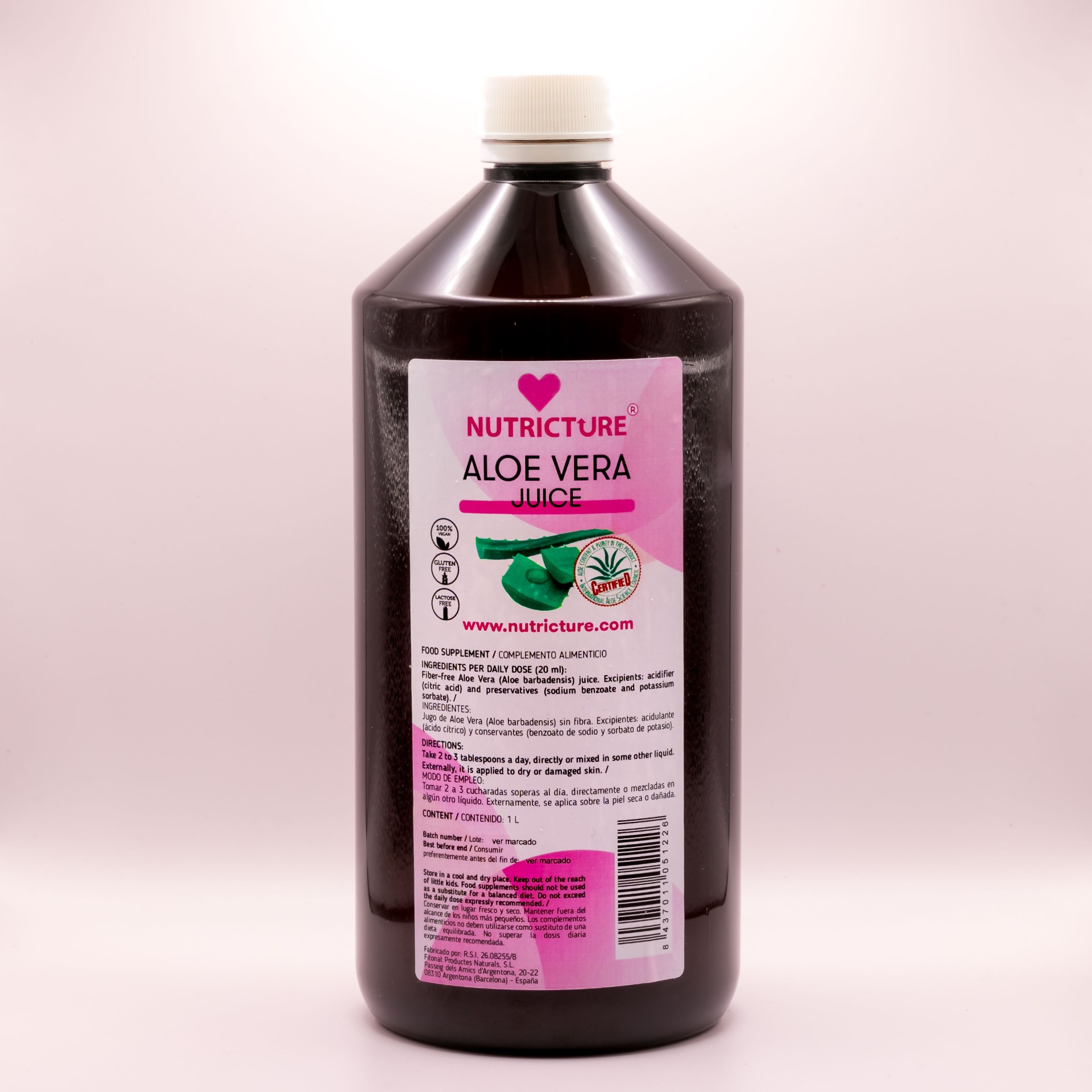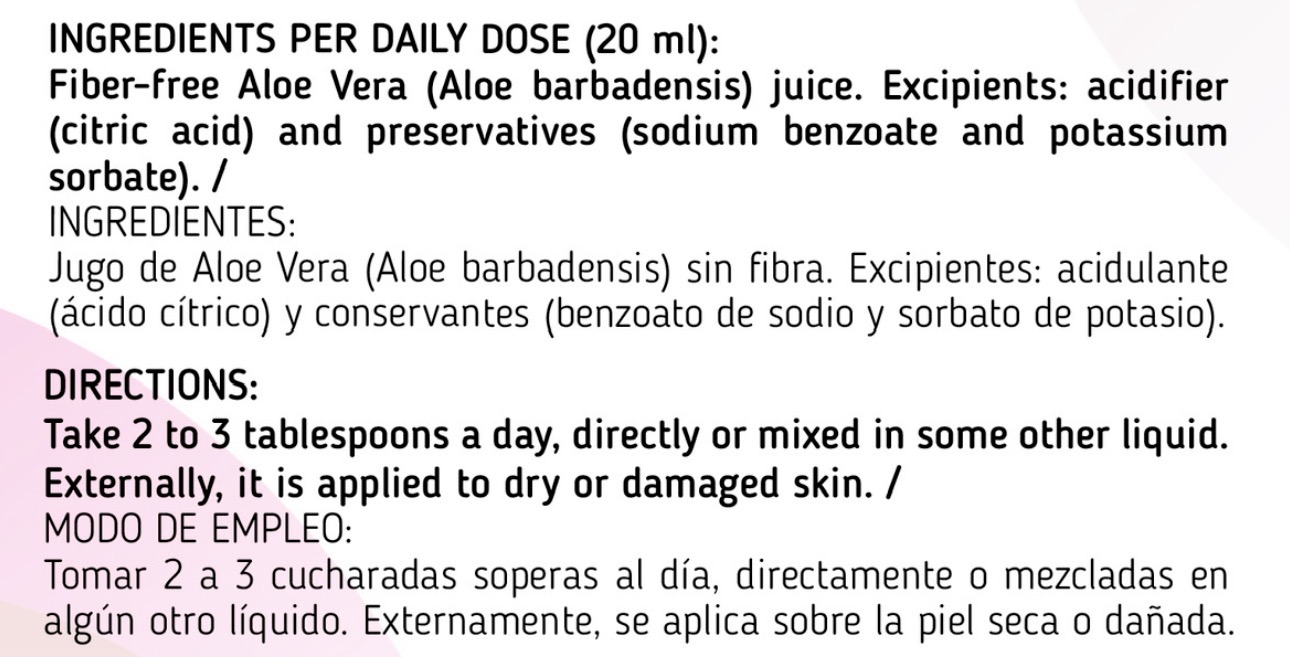 Jugo de Aloe Vera (Aloe barbadensis) sin fibra. Excipientes: acidulante (ácido cítrico) y conservantes (benzoato de sodio y sorbato de potasio).