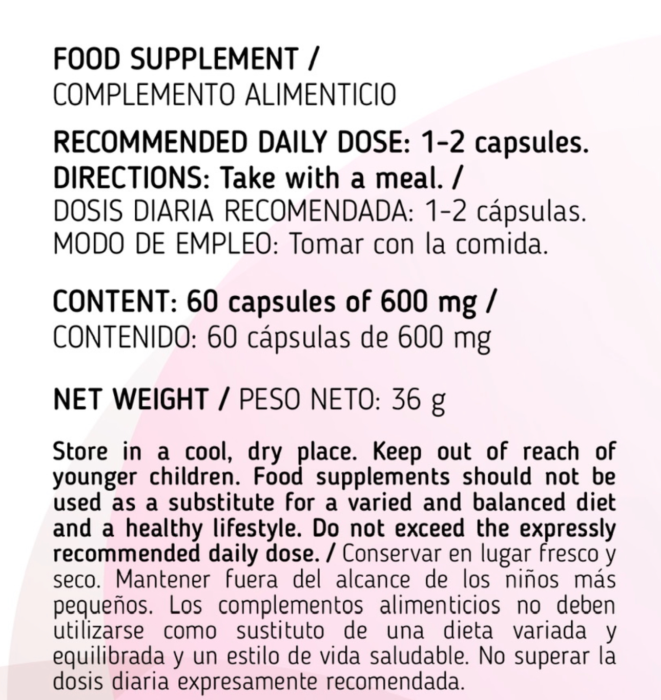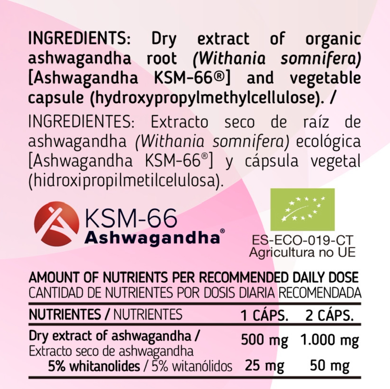 Extracto seco de raíz de ashwagandha (Withania somnifera) ecológica [Ashwagandha KSM-66R] y cápsula vegetal (hidroxipropilmetilcelulosa).