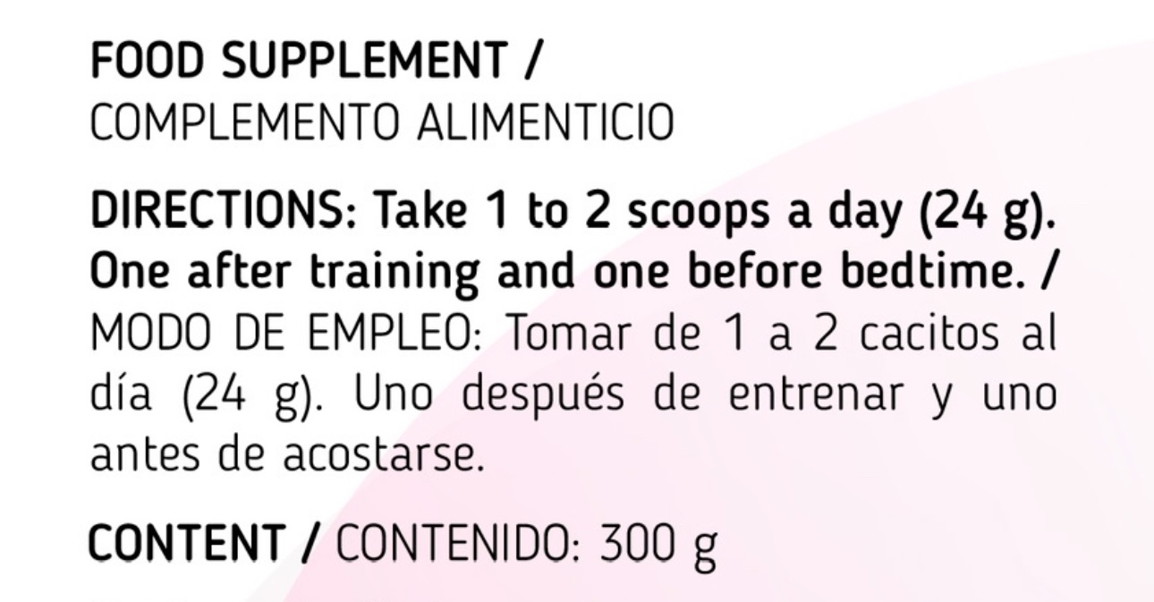 Tomar de 1 a 2 cacitos al día (24 gramos). Uno después de entrenar y uno antes de acostarse.