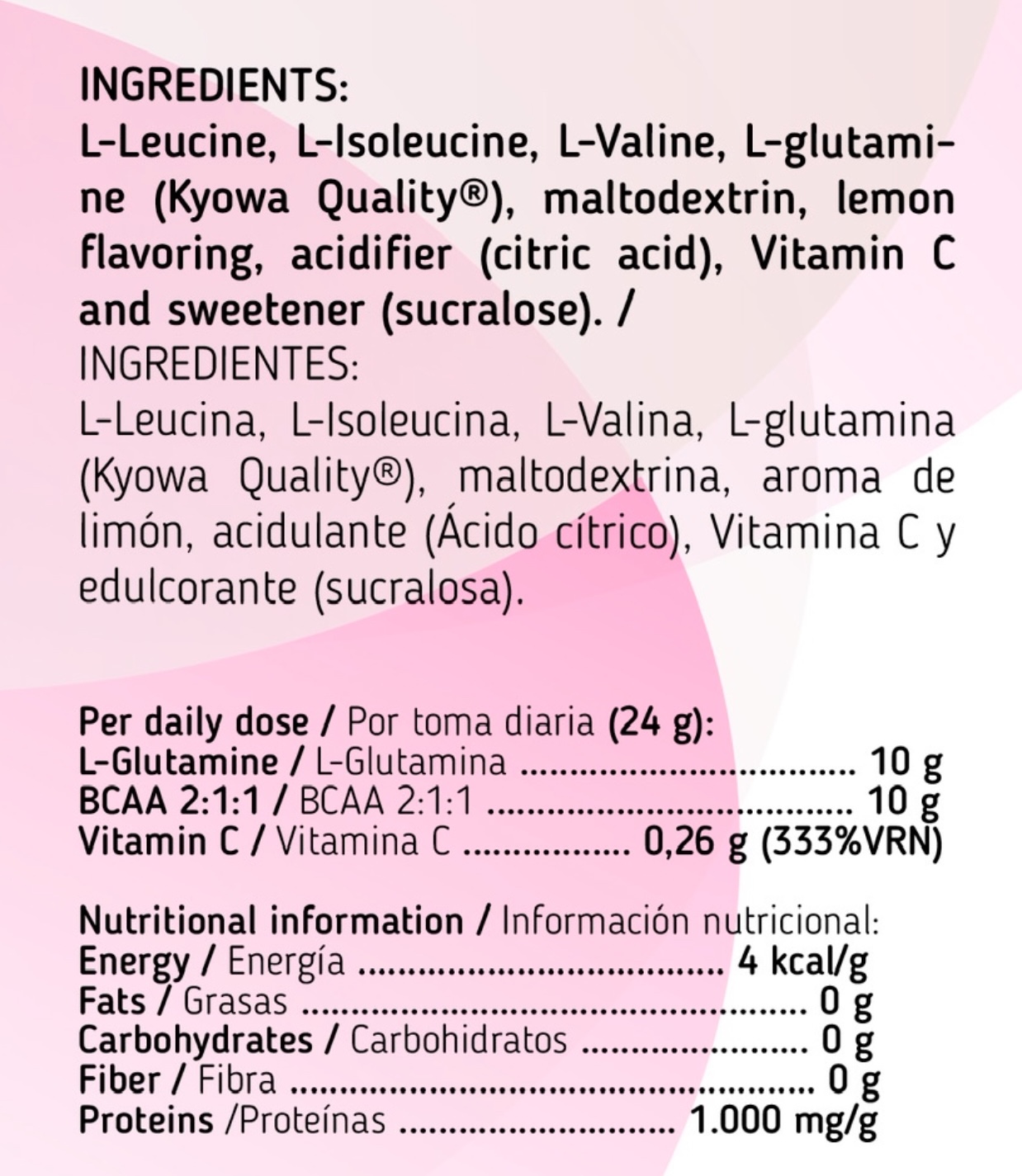 L-Leucina, L-Isoleucina, L-Valina, L-glutamina (Kyowa Quality®), maltodextrina, aroma de limón, acidulante (Ácido cítrico), Vitamina C y edulcorante (sucralosa).