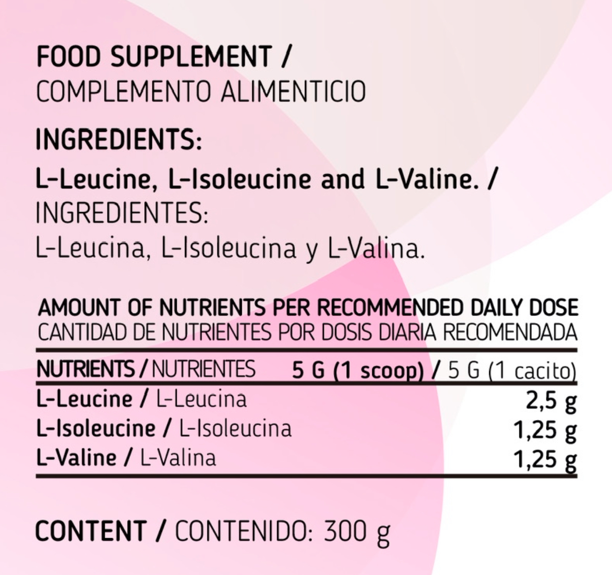 1 cazo (5 gramos): L-Leucina (2,5 gramos), L-Isoleucina (1,25 gramos) y L-Valina (1,25 gramos).