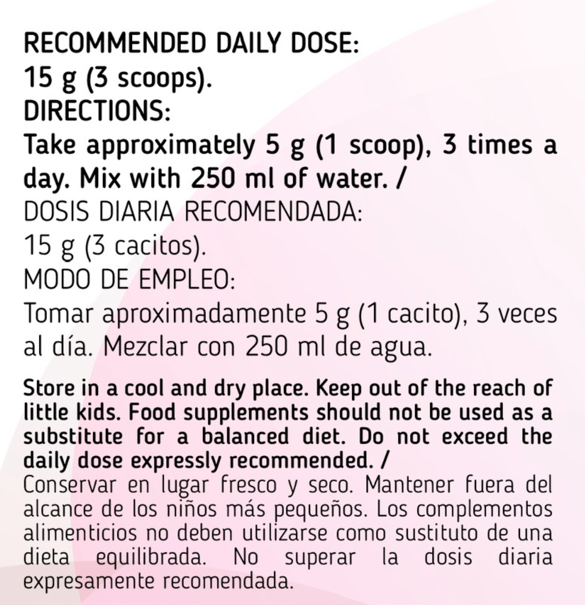 Tomar aproximadamente 5 g (1 cacito), 1 a 3 veces al día. Mezclar con 250 ml de agua.