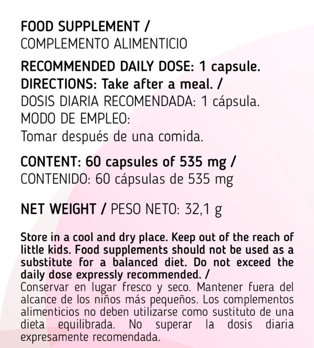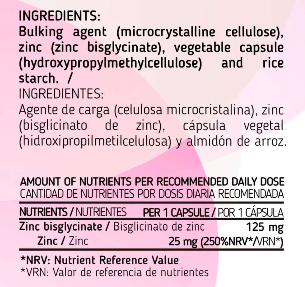 Agente de carga (celulosa microcristalina), zinc (bisglicinato de zinc), cápsula vegetal (hidroxipropilmetilcelulosa) y almidón de arroz.