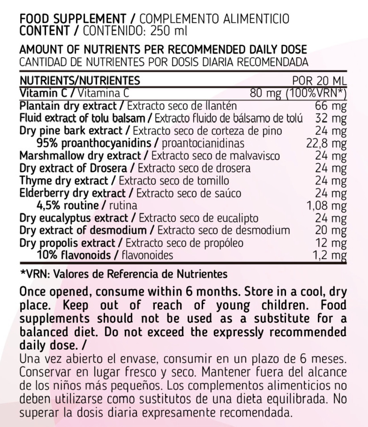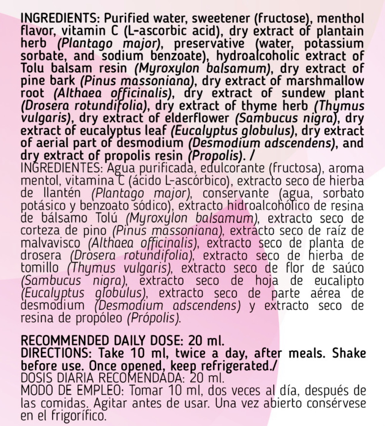 Agua purificada, edulcorante (fructosa), aroma mentol, vitamina C (ácido L-ascórbico), extracto seco de hierba de llantén (Plantago Major), conservante (agua, sorbato potásico y benzoato sódico), extracto hidroalcohólico de resina de bálsamo Tolú (Myroxylon balsamum), extracto seco de corteza de pino (Pinus massoniana), extracto seco de raíz de malvavisco (Althaea officinalis), extracto seco de planta de drosera (Drosera rotundifolia), extracto seco de hierba de tomillo (Thymus vulgaris), extracto seco de flor de saúco (Sambucus nigra), extracto seco de hoja de eucalipto (Eucalyptus globulus), extracto seco de parte aérea de desmodium (Desmodium adscendens) y extracto seco de resina de propóleo (Própolis).