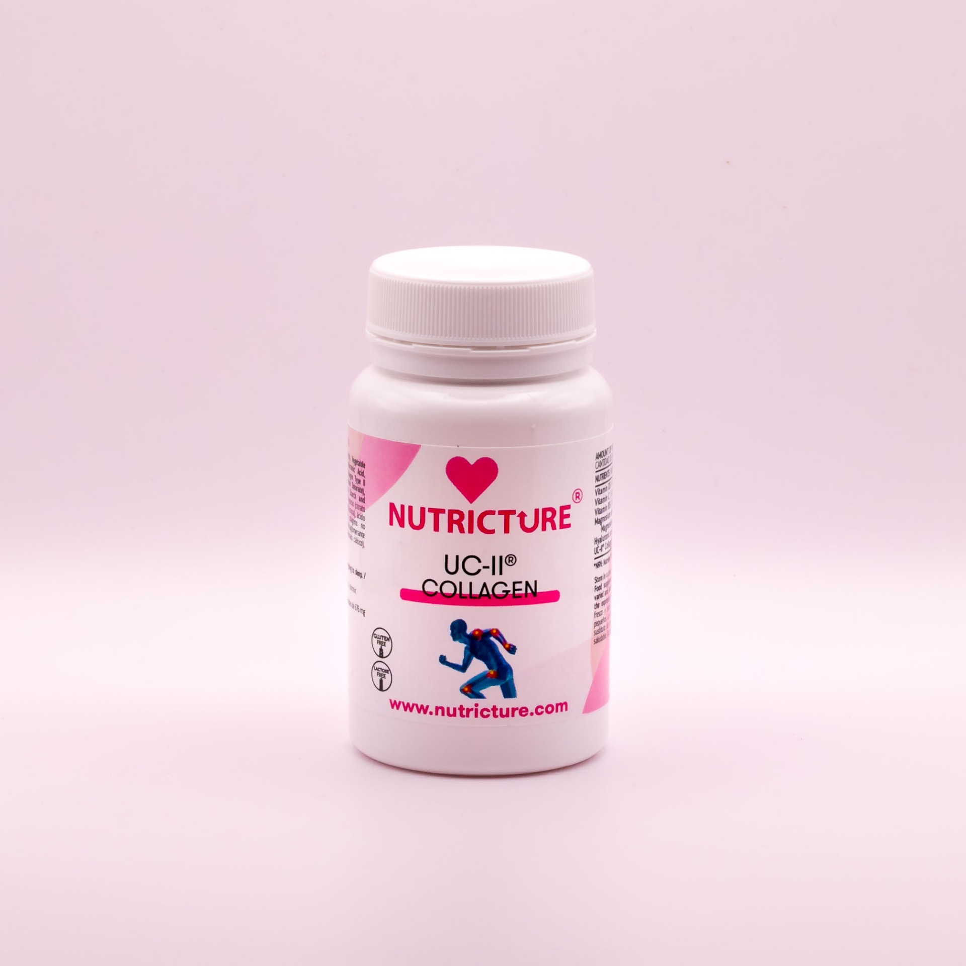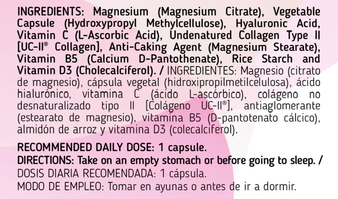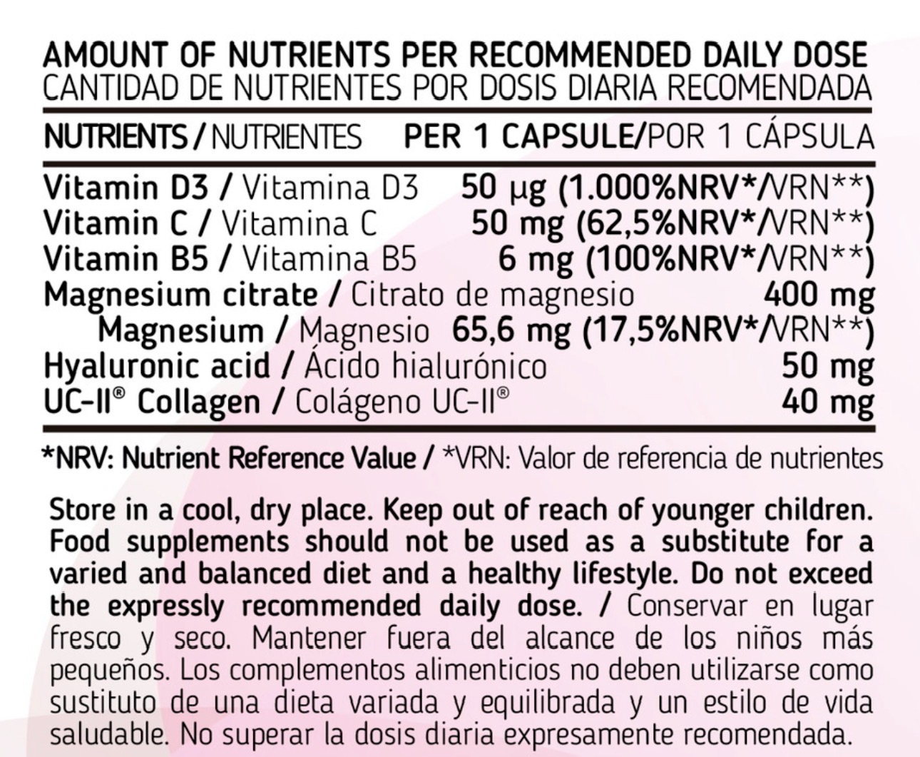 Magnesio (citrato de magnesio), capsula vegetal (hidroxipropilmetilcelulosa), acido hialurónico, vitamina C (ácido L-ascórbico), colágeno no desnaturalizado tipo || [Colágeno UC-II®], antiaglomerante (estearato de magnesio), vitamina B5 (D-pantotenato cálcico), almidón de arroz y vitamina D3 (colecalciferol).