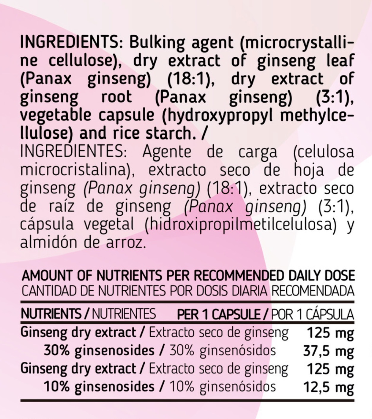 Agente de carga (celulosa microcristalina), extracto seco de hoja de ginseng (Panax ginseng) (18:1), extracto seco de raíz de ginseng (Panax ginseng) (3:1), cápsula vegetal (hidroxipropilmetilcelulosa) y almidón de arroz.