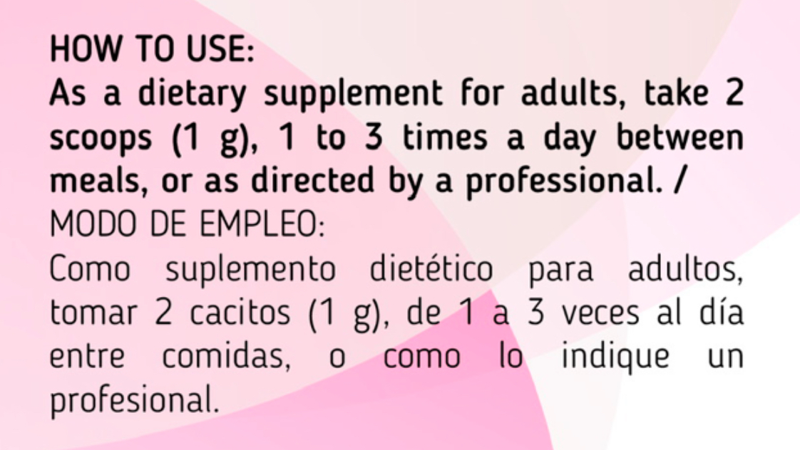 Como suplemento dietético para adultos tomar 2 cacitos (1 g), de 1 a 3 veces al día entre comidas, o como lo indique un profesional