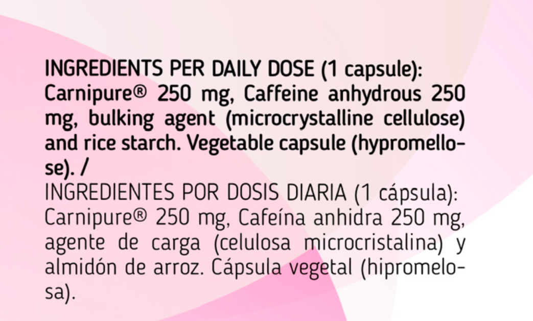 Carnipure® 250 mg, Cafeína anhidra 250 mg, agente de carga (celulosa microcristalina) y almidón de arroz. Cápsula vegetal (hipromelosa).
