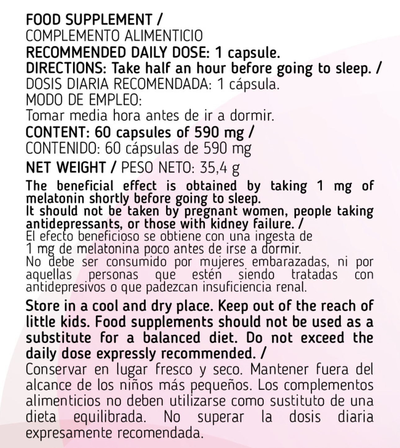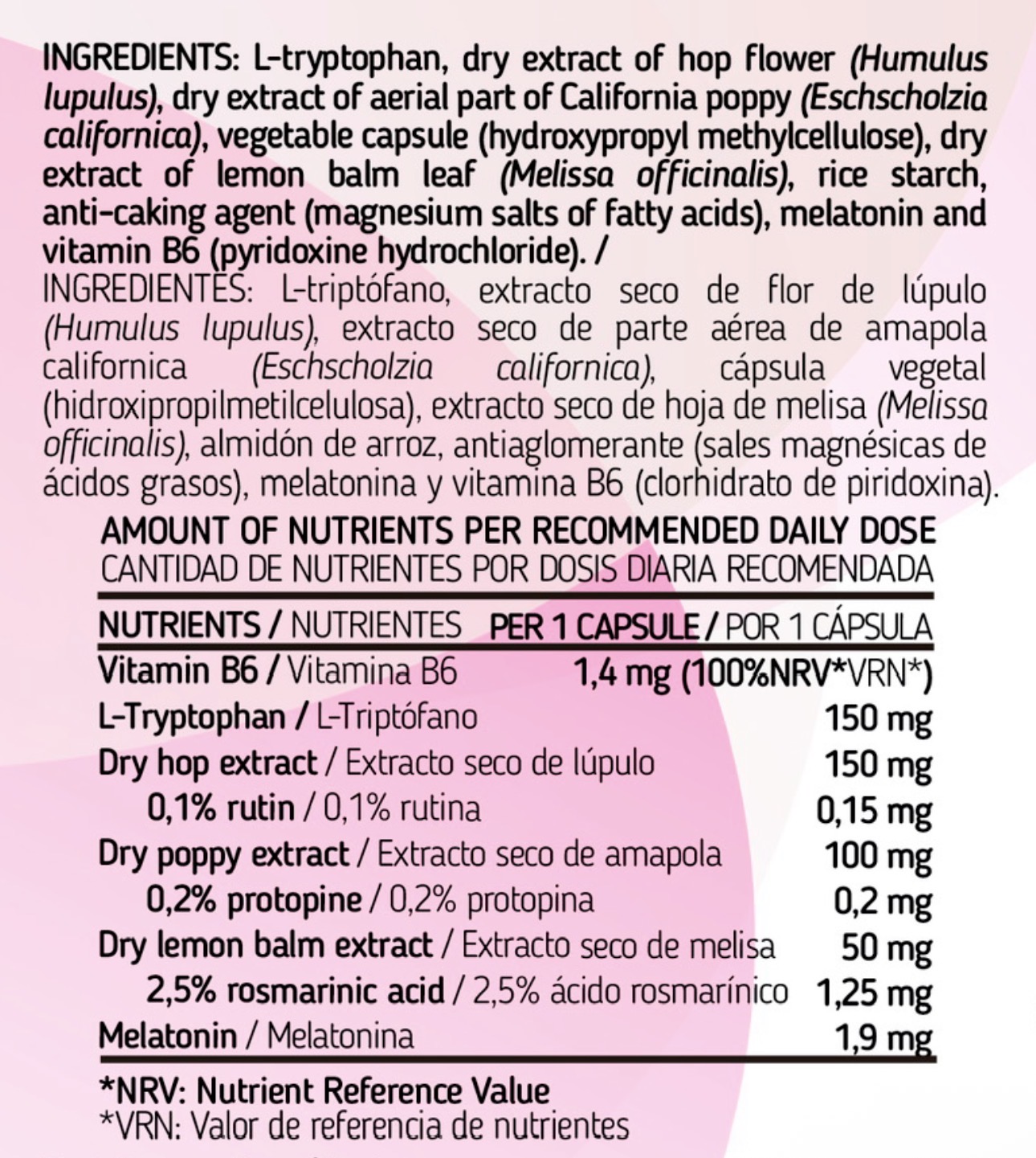 L-triptófano, extracto seco de flor de lúpulo (Humulus lupulus), extracto seco de parte aérea de amapola californica (Eschscholzia californica), cápsula vegetal (hidroxipropilmetilcelulosa), extracto seco de hoja de melisa (Melissa officinalis), almidón de arroz, antiaglomerante (sales magnésicas de ácidos grasos), melatonina y vitamina B6 (clorhidrato de piridoxina).