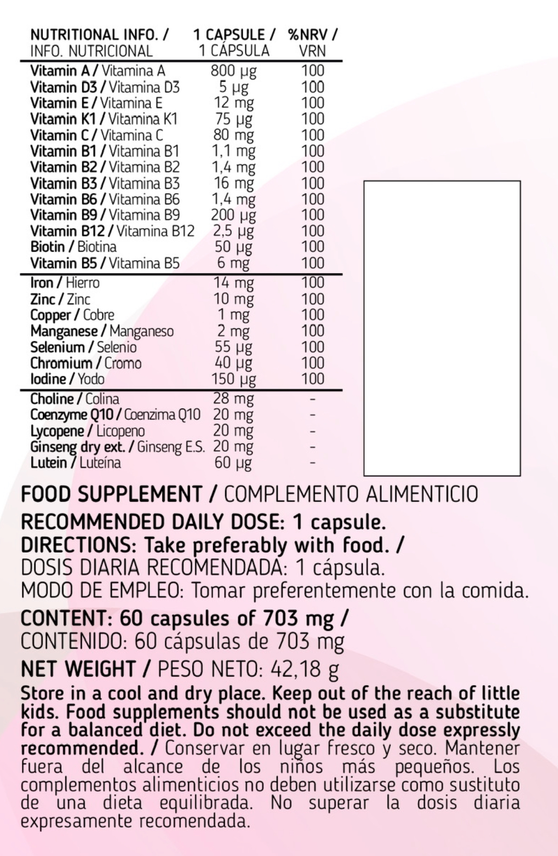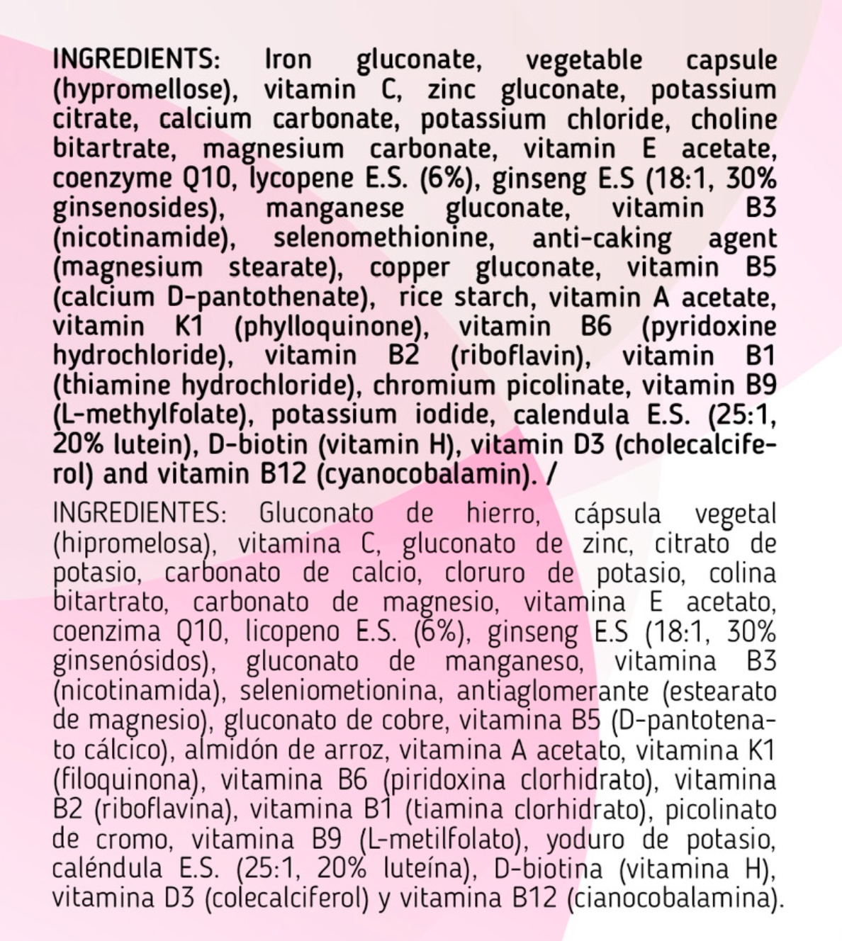 Gluconato de hierro, cápsula vegetal (hipromelosa), vitamina C, gluconato de zinc, citrato de potasio, carbonato de calcio, cloruro de potasio, colina bitartrato, carbonato de magnesio, vitamina E acetato, coenzima Q10, licopeno E.S. (6%), ginseng E.S (18:1, 30% ginsenósidos), gluconato de manganeso, vitamina B3 (nicotinamida), seleniometionina, antiaglomerante (estearato de magnesio), gluconato de cobre, vitamina B5 (D-pantotenato cálcico), almidón de arroz, vitamina A acetato, vitamina K1 (filoquinona), vitamina B6 (piridoxina clorhidrato), vitamina B2 (riboflavína), vitamina B1 (tiamina clorhidrato), picolinato de cromo, vitamina B9 (L-metilfolato), yoduro de potasio, calendula E.S. (25:1, 20% luteína), D-biotina (vitamina H), vitamina D3 (colecalciferol) y vitamina B12 (cianocobalamina).