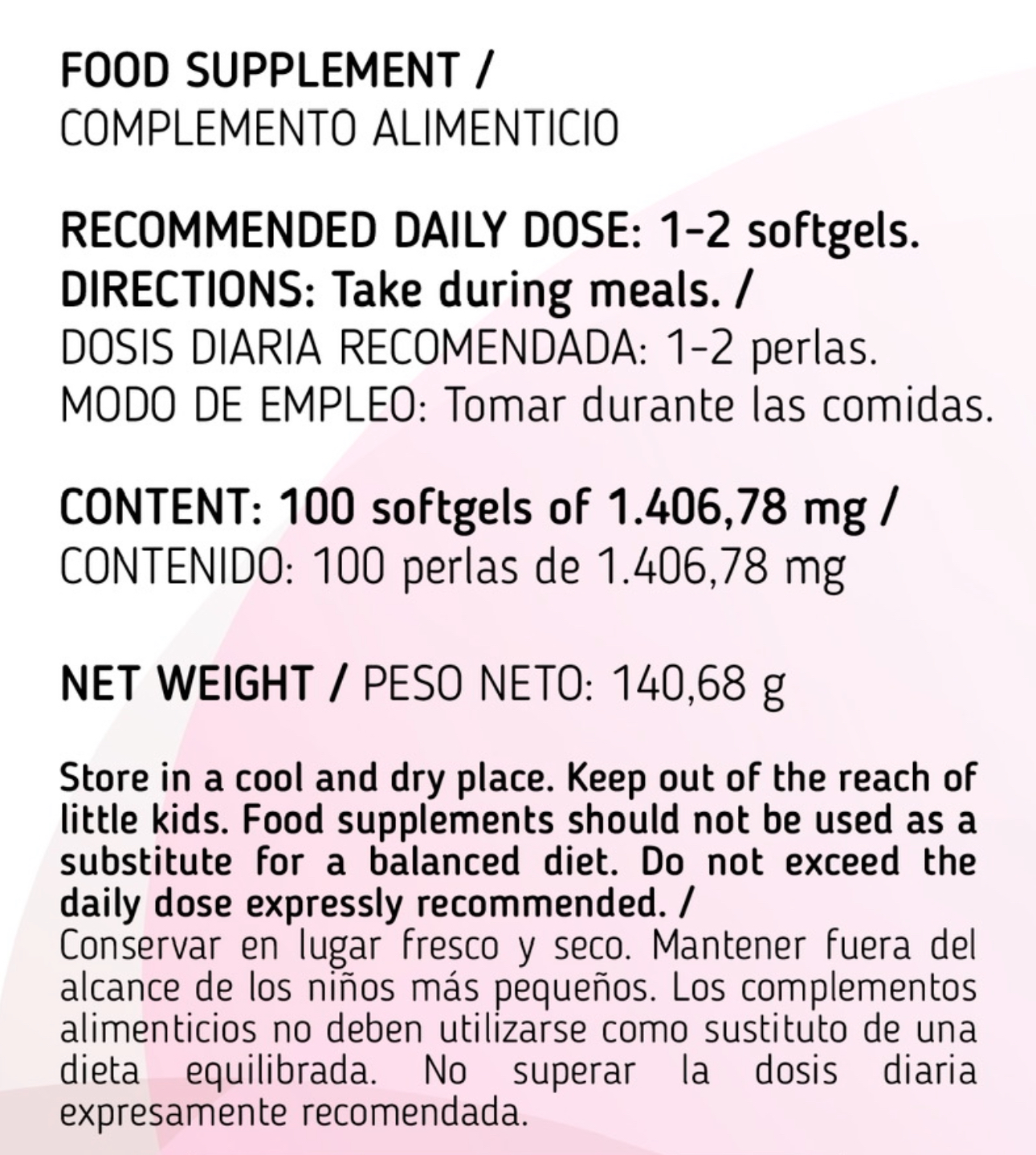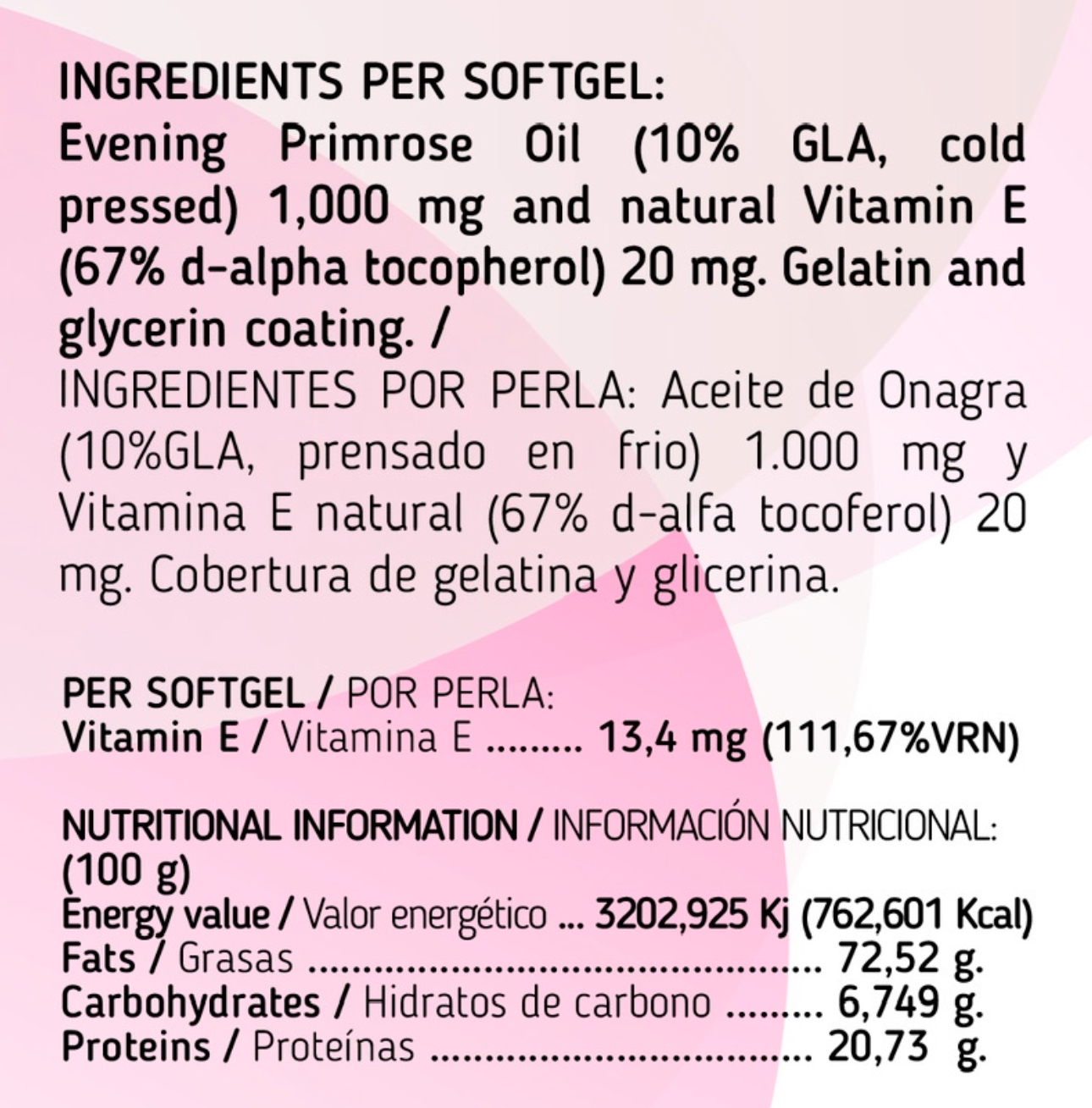 Aceite de Onagra (10%GLA, prensado en frio) 1.000 mg y Vitamina E natural (67% d-alfa tocoferol) 20 mg. Cobertura de gelatina y glicerina.