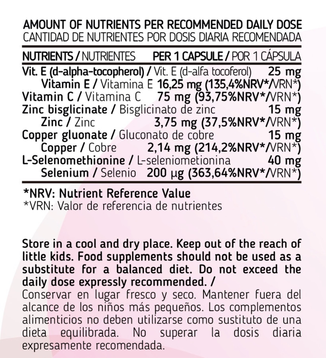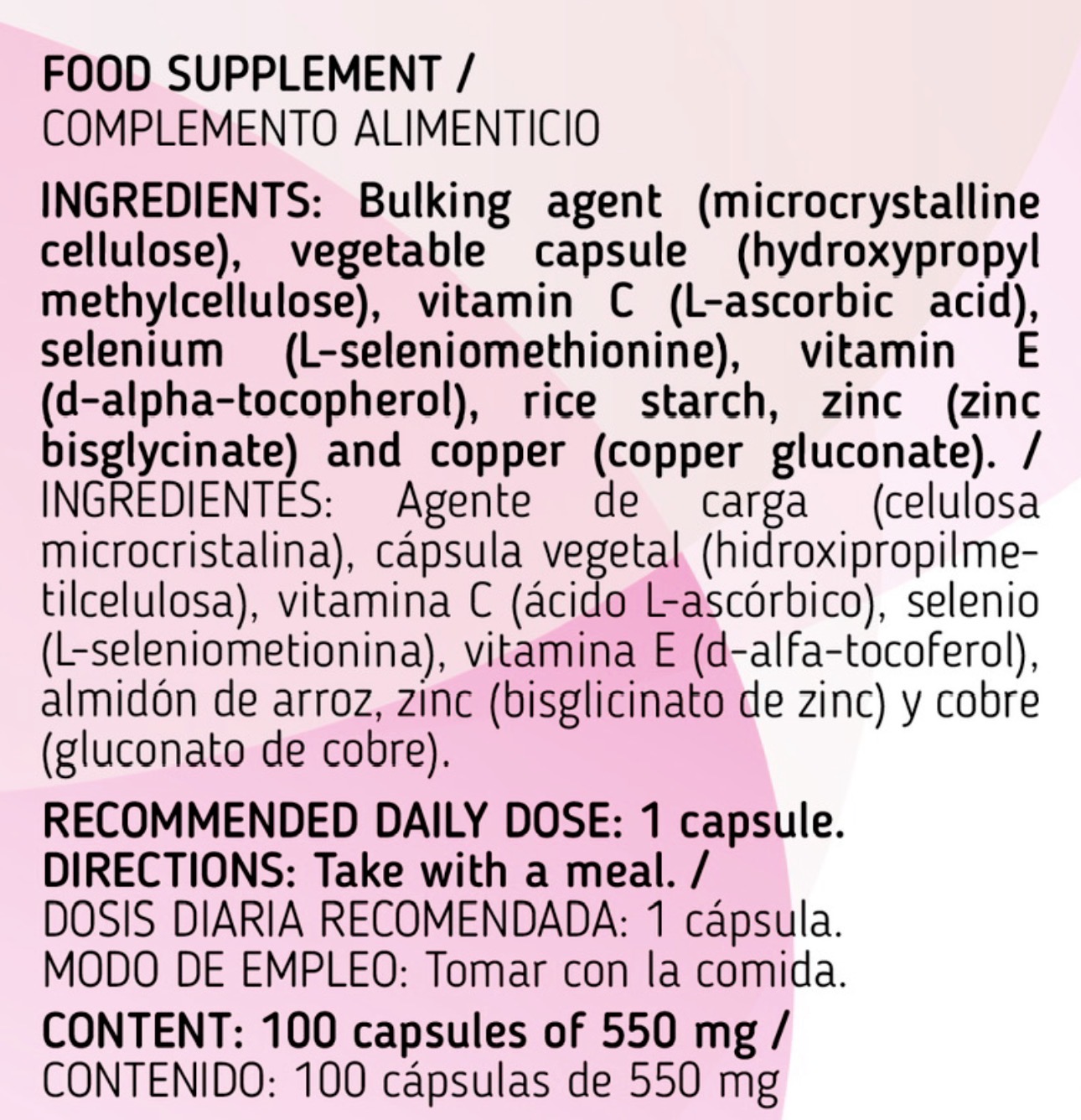 Agente de carga celulosa microcristalina), cápsula vegetal (hidroxipropilmetilcelulosa), vitamina C (ácido L-ascórbico), selenio (L-seleniometionina), vitamina E (d-alfa-tocoferol), almidón de arroz, zinc (bisglicinato de zinc) y cobre (gluconato de cobre).