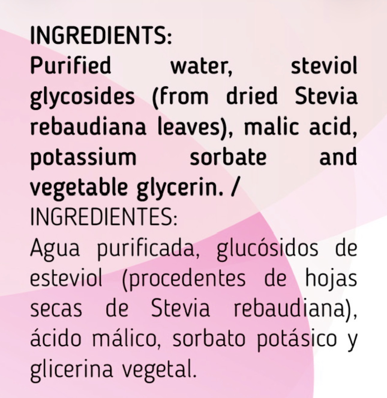 Agua purificada, glucósidos de esteviol (procedentes de hojas secas de Stevia rebaudiana), ácido málico, sorbato potásico y glicerina vegetal.