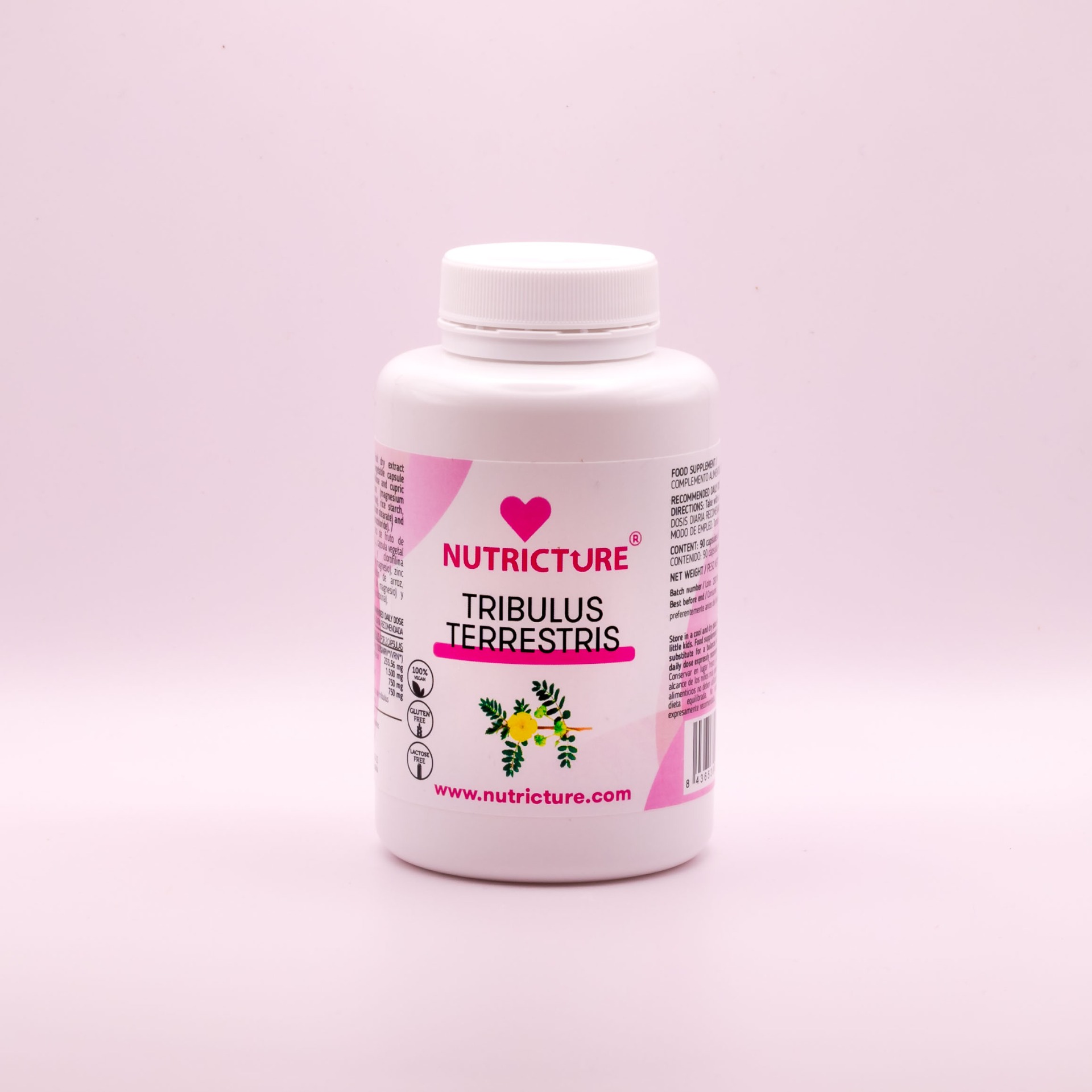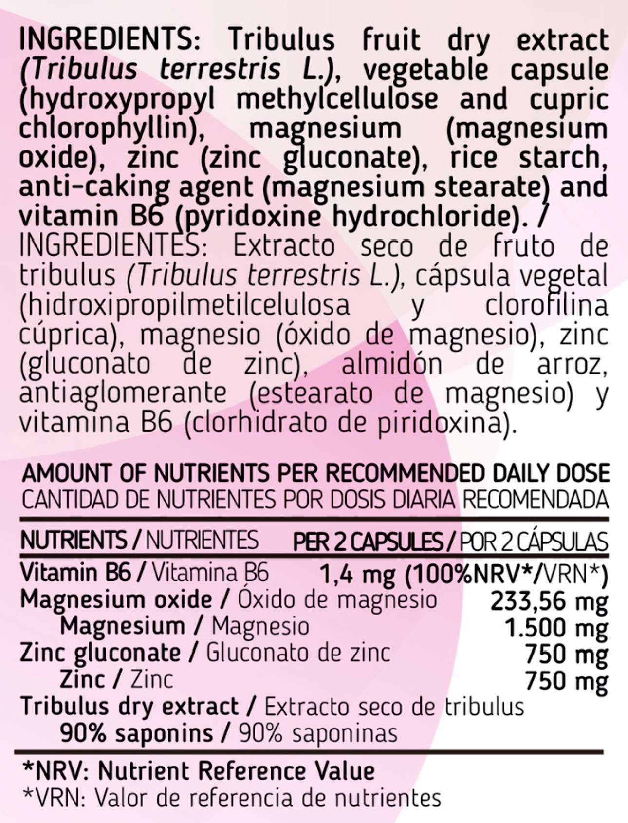 Extracto seco de fruto de tribulus (Tribulus terrestris L.), cápsula vegetal (hidroxipropilmetilcelulosa y clorofilina cúprica), magnesio (óxido de magnesio), zinc (gluconato de zinc), almidón de arroz, antiaglomerante (estearato de magnesio) y vitamina B6 (clorhidrato de piridoxina).
