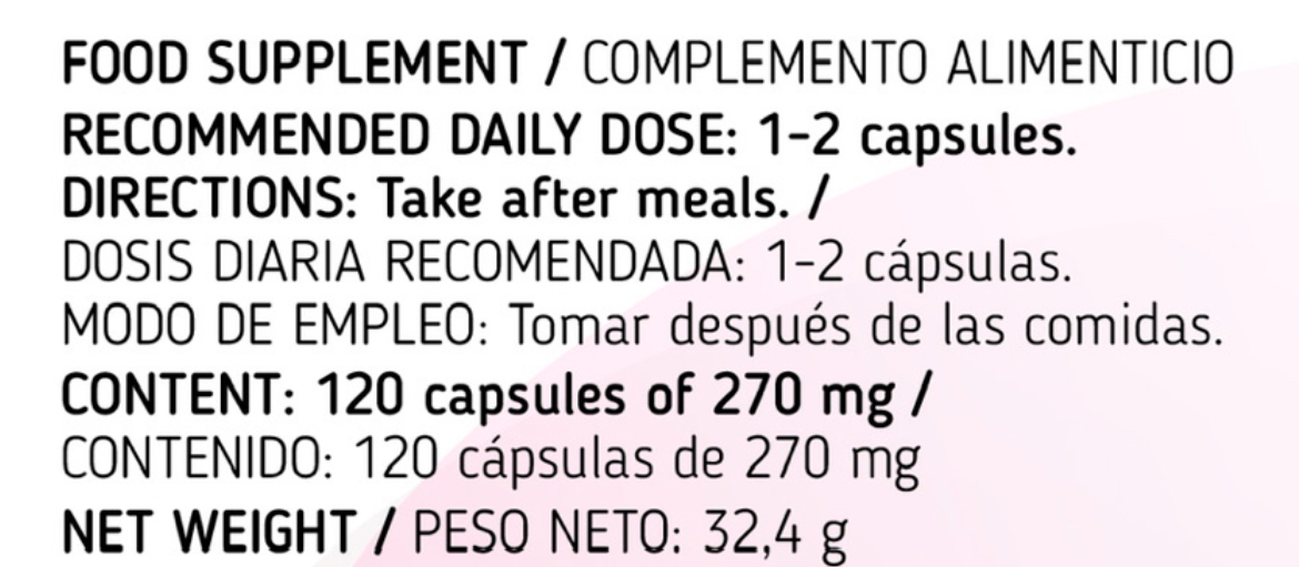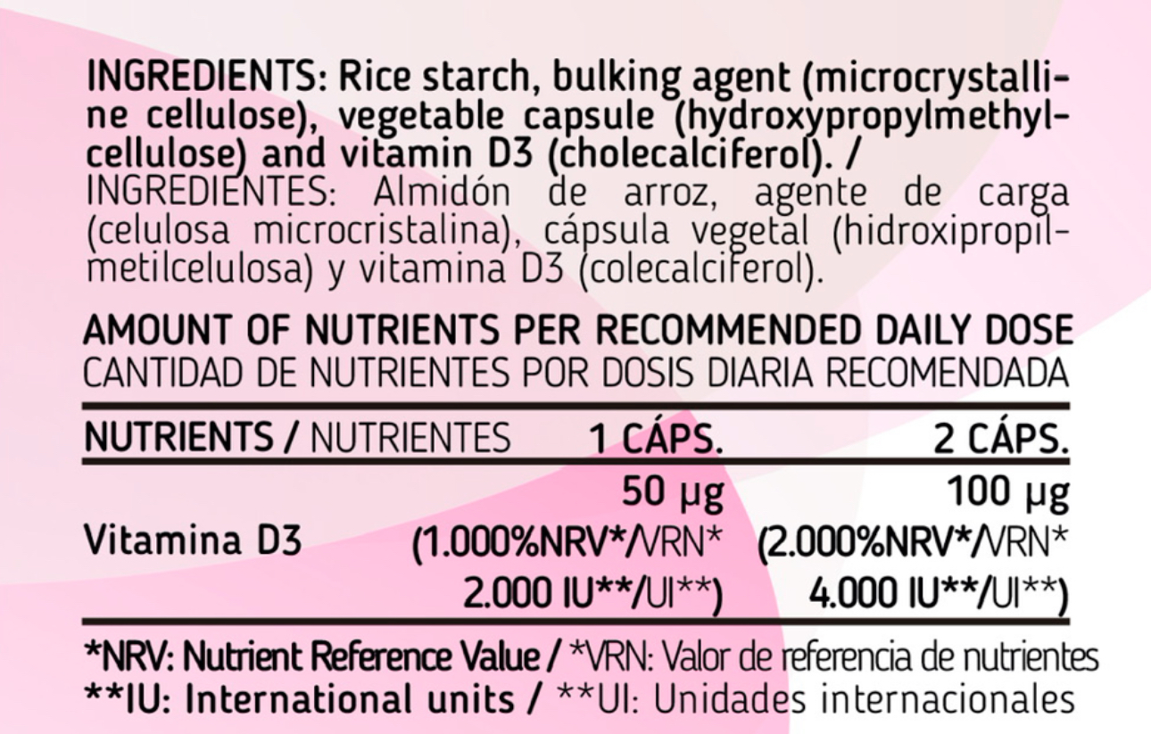 Almidón de arroz, agente de carga (celulosa microcristalina), cápsula vegetal (hidroxipropilmetilcelulosa) y vitamina D3 (colecalciferol).